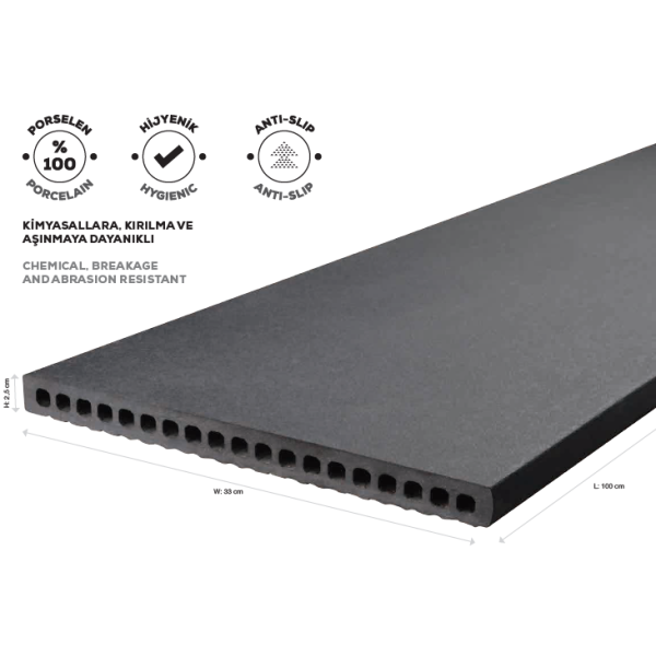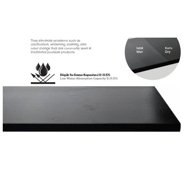 Nerostone je dizajniran za ugradnju na rubovima bazena, posebno za danas veoma popularan sistem prelivanja sa skrivenim kanalom na ivicama bazena, i izrađen je od 100% porcelana.