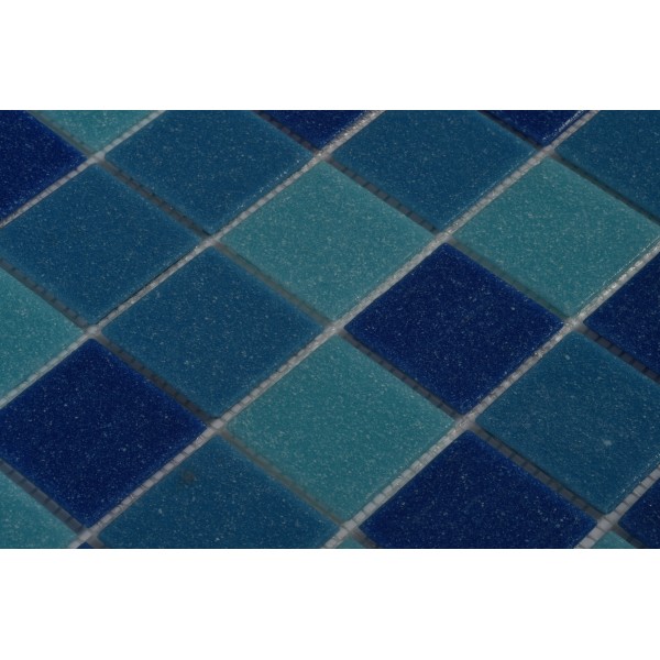 Stakleni mozaik Big Blue u kombinaciji različitih nijansi plave boje. Dimenzija sastavnih delova pločica 50x50mm, dimenzija pločice 315x315mm.