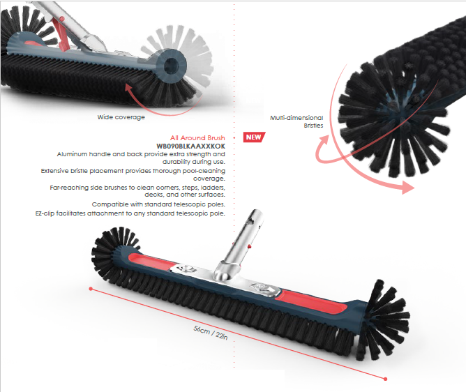 Četka za bočnim četkicama je specijalizovani alat koji je savršen za temeljno čišćenje ravnih površina i uglova bazena. Ova četka je dizajnirana tako da efikasno uklanja prljavštinu, alge, naslage i druge nečistoće sa površina koje je teško očistiti sa standardnim četkama, naročito u teško dostupnim uglovima. Sa svojim bočnim četkicama, koje omogućavaju čišćenje ivica i uglova bazena, ona je izuzetno efikasna u održavanju higijene na svim delovima bazena.