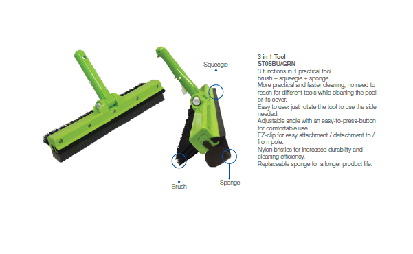 Ovaj 3u1 alat je veoma praktičan i jednostavan za korišćenje, jer omogućava brzo prebacivanje između funkcija, čime štedi vreme i trud tokom održavanja bazena. Kompaktna i ergonomski dizajnirana ručka omogućava lako rukovanje i udobno čišćenje svih površina, dok je alat kompatibilan sa teleskopskim šipkama, što olakšava rad u većim bazenima i u teško dostupnim mestima.