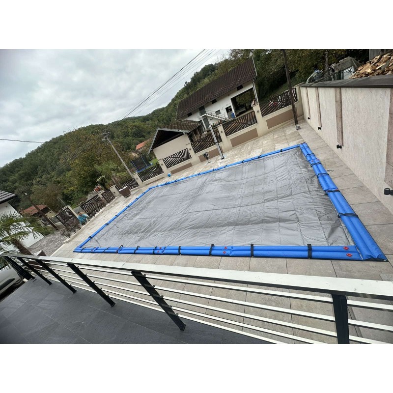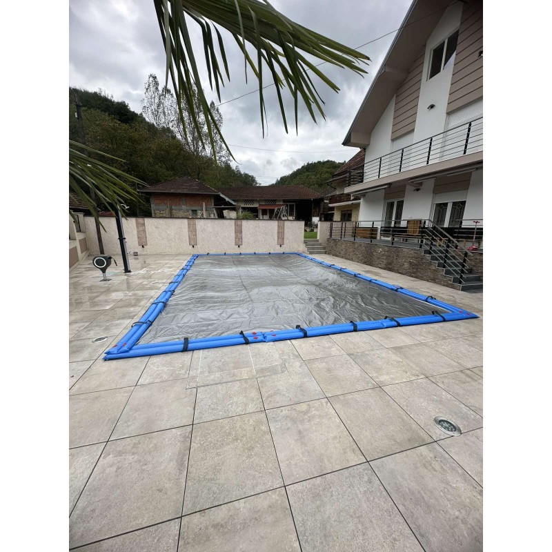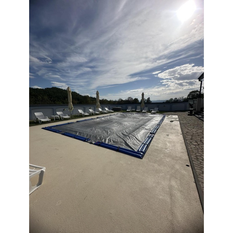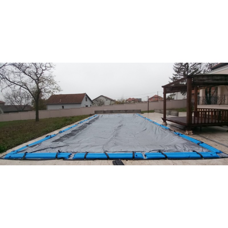 Zimski prekrivač za bazen u srebrno/crnoj boji izrađen je od laminirane polietilenske folije s debelim opšivanjem polietilena visoke gustine što osigurava vrhunsku izdržljivost. Preklopi su tretirani tako da pružaju maksimalnu otpornost na ultra ljubičaste zrake što omogućava dugovečnost. Debljina je 200 mikrona.Vodopropusni pokrivac.