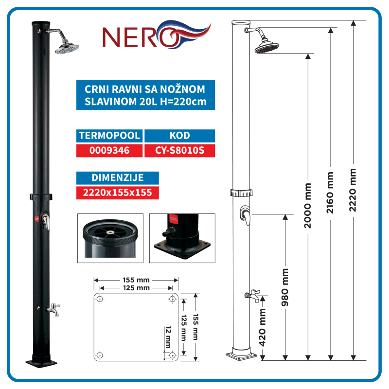 Solarni tusevi zagrevaju vodu zahvaljujuci suncevoj energiji i ne trose elekricnu energiju . Postavljaju se u basti, na terasi ili u blizini bazena .Solarni tus od PVC -a, zapremine 20L u crnoj boji sa slavinom za podesavanje hladne i tople vode i noznom slavinom. Instalacija tusa je vrlo jednostavna .