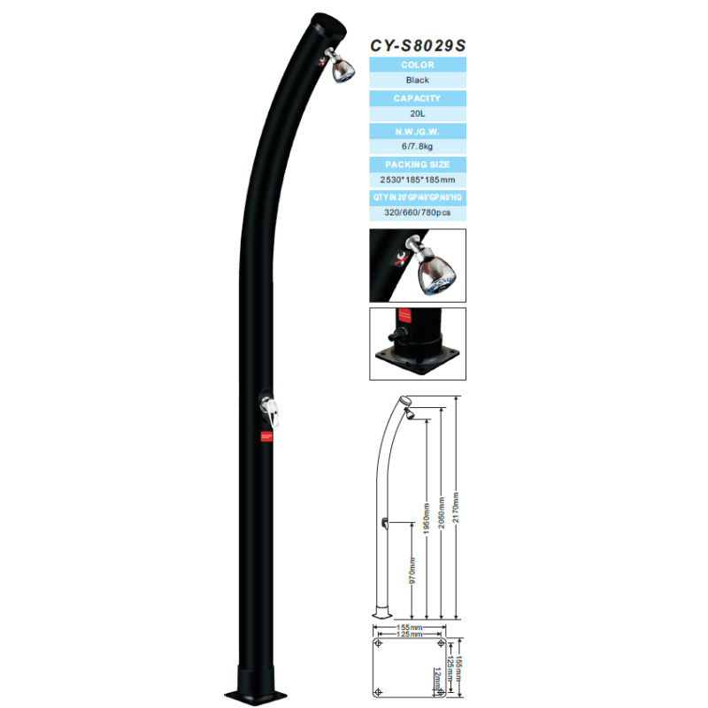 Solarni tusevi zagrevaju vodu zahvaljujuci suncevoj energiji i ne trose elekricnu energiju . Postavljaju se u basti, na terasi ili u blizini bazena .Solarni tus od PVC -a, zapremine 20L u crnoj boji sa slavinom za podesavanje hladne i tople vode, lučni. Instalacija tusa je vrlo jednostavna .