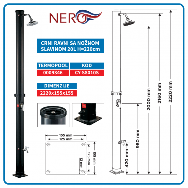Solarni tusevi zagrevaju vodu zahvaljujuci suncevoj energiji i ne trose elekricnu energiju . Postavljaju se u basti, na terasi ili u blizini bazena .Solarni tus od PVC -a, zapremine 20L u crnoj boji sa slavinom za podesavanje hladne i tople vode i noznom slavinom. Instalacija tusa je vrlo jednostavna .