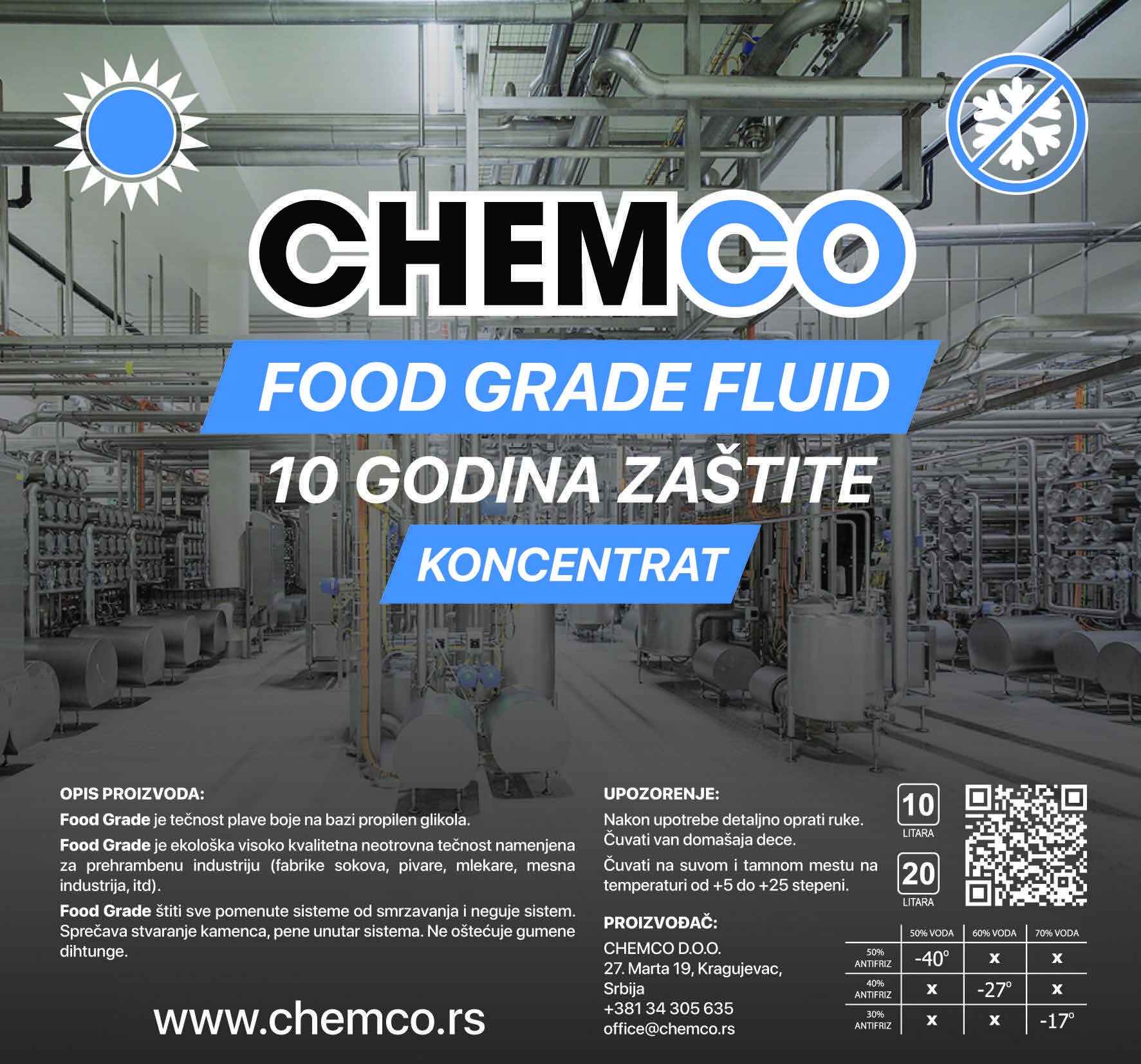 Food grade je tečnost plave boje na bazi mono propilen glikola. Ekološka i visoko kvalitetna neotrovna tečnost namenjena za klasične solarne sisteme i sisteme koji se koriste u prehrambenoj industriji. Štiti sisteme (fabrike sokova, pivare, mlekare, mesna industrija) od smrzavanja i neguje sistem. Sprečava stvaranje kamenca i pojavu pene unutar sistema. Ne oštećuje gumene dihtunge. Razblažen u odnosu 50%-50% se može koristiti od -40 do +150C.