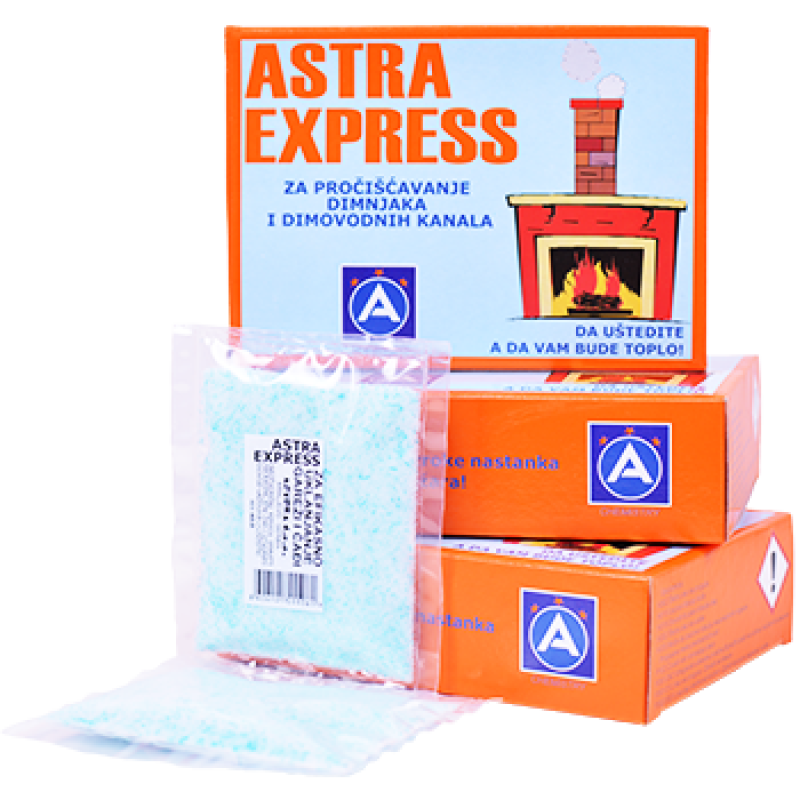 ASTRA EXPRESS je prah za katalitičko uklanjanje smole i gareži u dimnjaku i dimovodnim kanalima - sagoreva na 420 stepeni dok je uobičajena temperatura u ložištu preko 800 stepeni. Sagorevanjem praha nalepi smole postaju krti i trošni i lako se odlepljuju od zidova dimnjaka i dimovodnih kanala oslobađajući put dimnim gasovima.