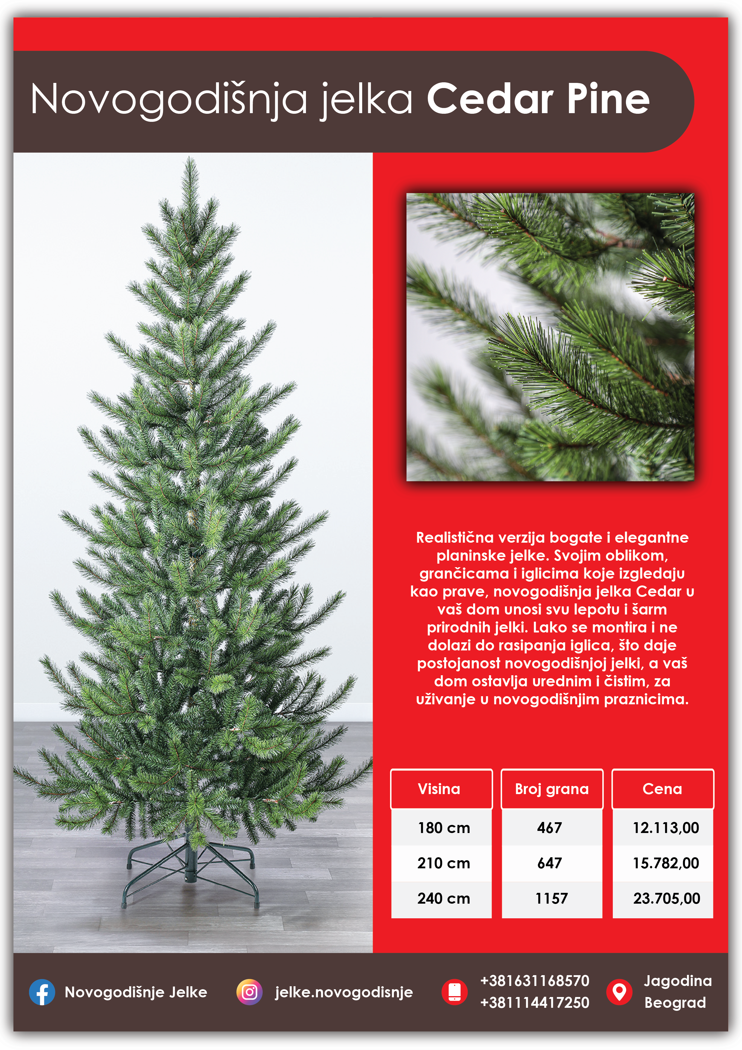 Realistična verzija bogate i elegantne planinske jelke. Svojim oblikom, grančicama i iglicima koje izgledaju kao prave, novogodišnja jelka Cedar u vaš dom unosi svu lepotu i šarm prirodnih jelki. Lako se montira i ne dolazi do rasipanja iglica, što daje postojanost novogodišnjoj jelki, a vaš dom ostavlja urednim i čistim, za uživanje u novogodišnjim praznicima.