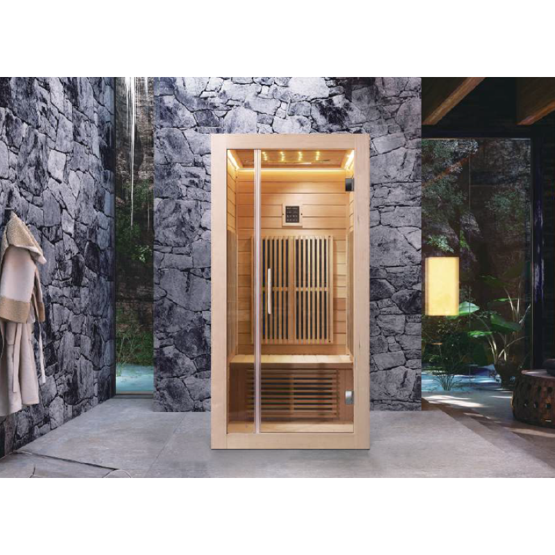 Uživajte u luksuznom spa doživljaju kod kuće sa sauna sobom Nero, izrađenom od kvalitetnog kanadskog Hemlock drveta. Ovaj kompaktni model je dizajniran za 2 osobe, sa dimenzijama 1200 x 1900 x 1900 mm, i nudi savremen Infra Red sistem grejanja za brzo i ravnomerno zagrevanje.