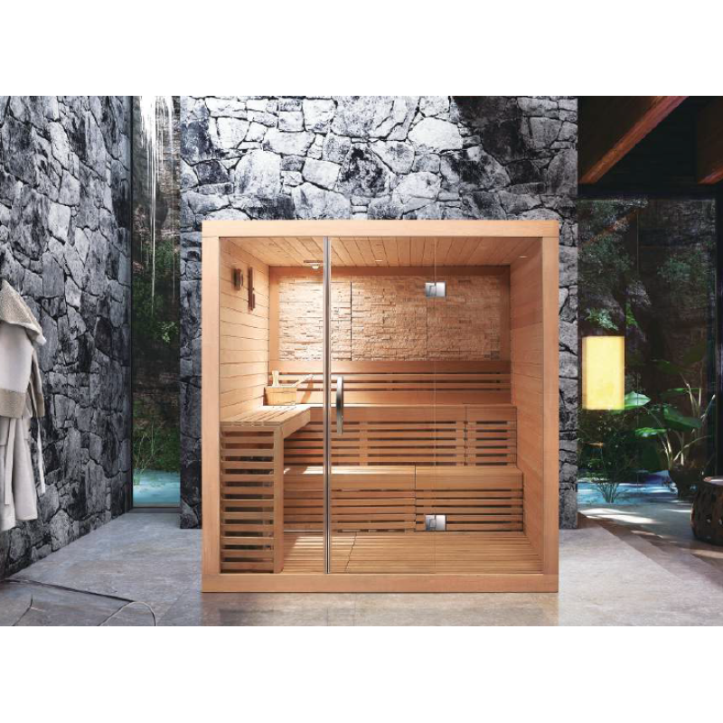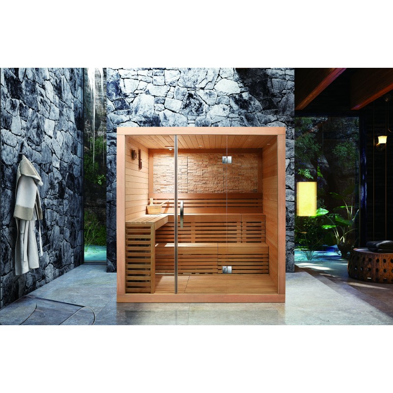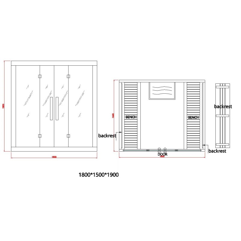 Uživajte u vrhunskom spa doživljaju kod kuće sa sauna sobom Nero, izrađenom od kvalitetnog kanadskog Hemlock drveta. Ovaj model je dizajniran za 4 osobe, sa dimenzijama 1800 x 1500 x 2000 mm, težinom 120 kg, i snažnom peći od 4,5 kW (220V / 380V) koja omogućava brzo i ravnomerno zagrevanje prostora.