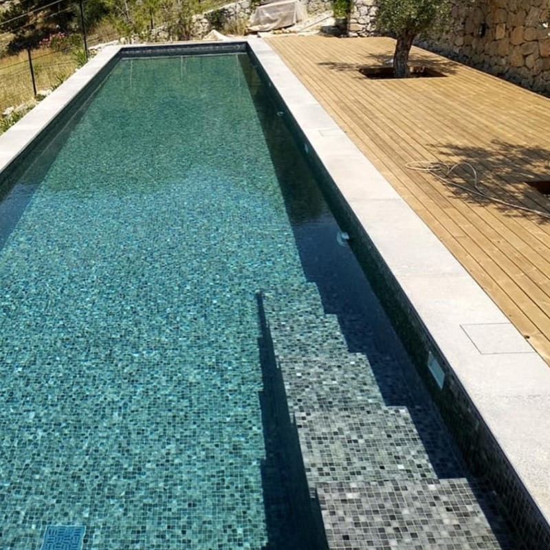 Protiv klizni mozaik : Ovaj model staklenog mozaika , takodje možete pronaći i u protiv kliznoj opciji za montažu na delovima bazena kao što su : rub bazena , klupe , stepenište .