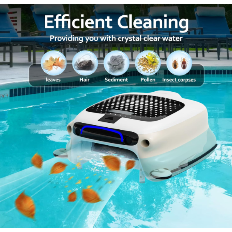 Bežična, dugotrajna baterija. Efikasno hvata plutajuće ostatke pre nego što legnu na dno bazena. Pogodno za upotrebu u bilo koje doba dana ili u svim vremenskim uslovima.