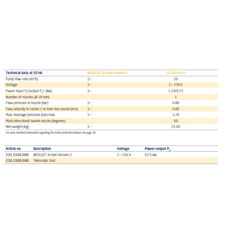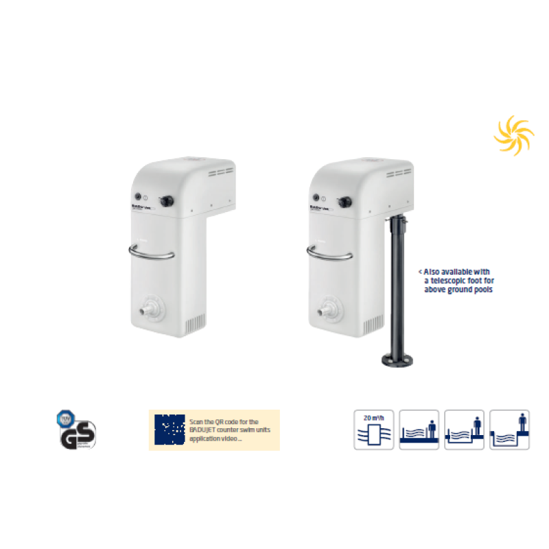 Čista snaga podesive mlaznice izaziva plivača da postigne maksimalne performanse u sopstvenom bazenu. BADUJET Active Version 2 je dizajniran za nadogradnju postojećih jedinica tako da se savršeno prilagođava svakom bazenu. Mala, pouzdana, ali izuzetno jeftina jedinica za plivanje nudi sve što vam je potrebno za opuštanje. Ima funkciju za kupanje sa mehurićima, kao i opciono crevo za masažu za stvaranje oaze opuštanja. Teleskopska stopa za nadzemne bazene je takođe dostupna kao opcija.