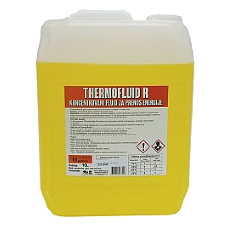 TERMOFLUID R je koncetrovana tečnost za prenos termičke energije. Termofluid R je antifriz za centralno grejanje koji nalazi primenu kod sistema za grejanje i rashlađivanje u temperaturnom opsegu od -35°C do 150°C. Termofluid R je na bazi monoetilen glikola i kao takav razblažuje se sa vodom u određenim razmerama u zavisnosti od očekivane temerature rada sistema. Olakšava rad cirkulacionih pumpi i obezbeđuje sistemu grejanja kao i radijatorima antikorozivnu zaštitu tokom dugog veka eksploatacije. Odlikuje ga dug vek eksploatacije od 10 godina.
