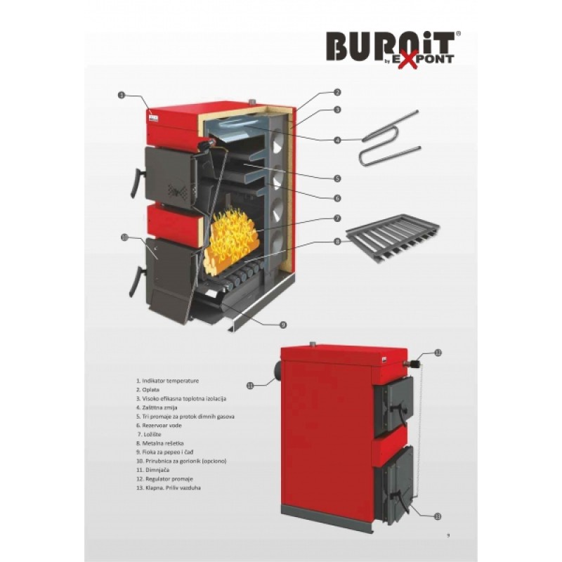 Burnit čelični kotlovi na čvrsto gorivo (drva i ugalj) sa mogućnošću ugradnje gorionika na pelet. Otvor za gorionik sa posebno izrađenim prirubnicama se nalazi na donjim vratima na kojima se montira Burnit gorionik za pelet. Kotao je izrađen od kotlovskog čelika debljine 5 mm u komori za sagorevanje i 4 mm na hladnoj strani. Ložište ima veliku površinu za prenos toplote, velika vrata i ložište je velikih dimenzija omogućava lako loženje (cepanice dužine do 50cm). Ložište poseduje i dodatnu metalnu zaštitnu rešetku koja štiti vodeni rost od oštećenja i vatre. Sagorevanje kontroliše termostatski regulator promaje, potpuno mehanički uređaj koji obezbeđuje krajnju pouzdanost. Na taj način se kontroliše dotok vazduha u komoru za sagorevanje, čime se postiže optimalni režim rada kotla.
