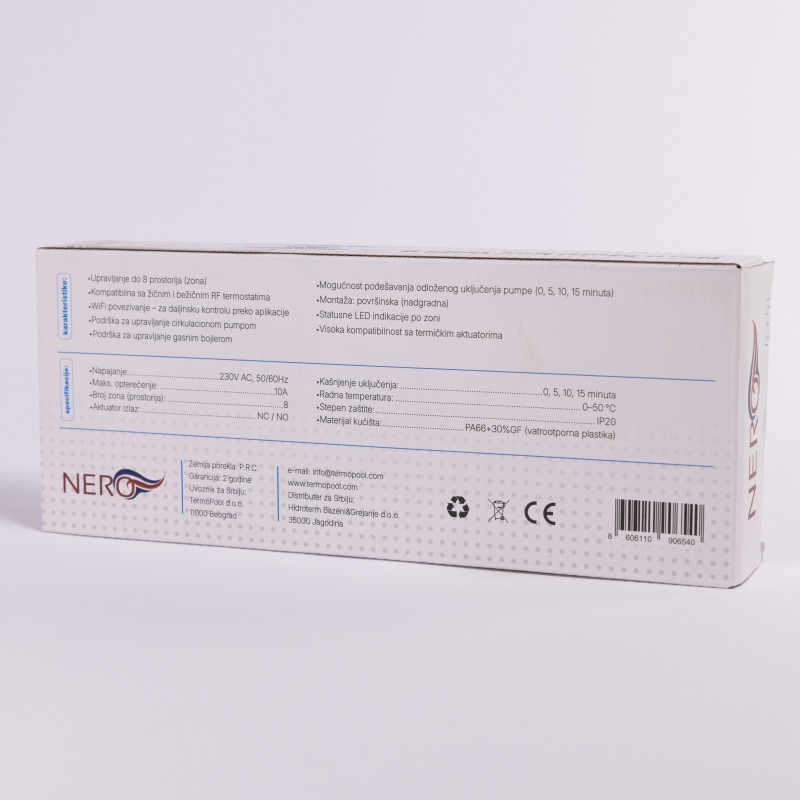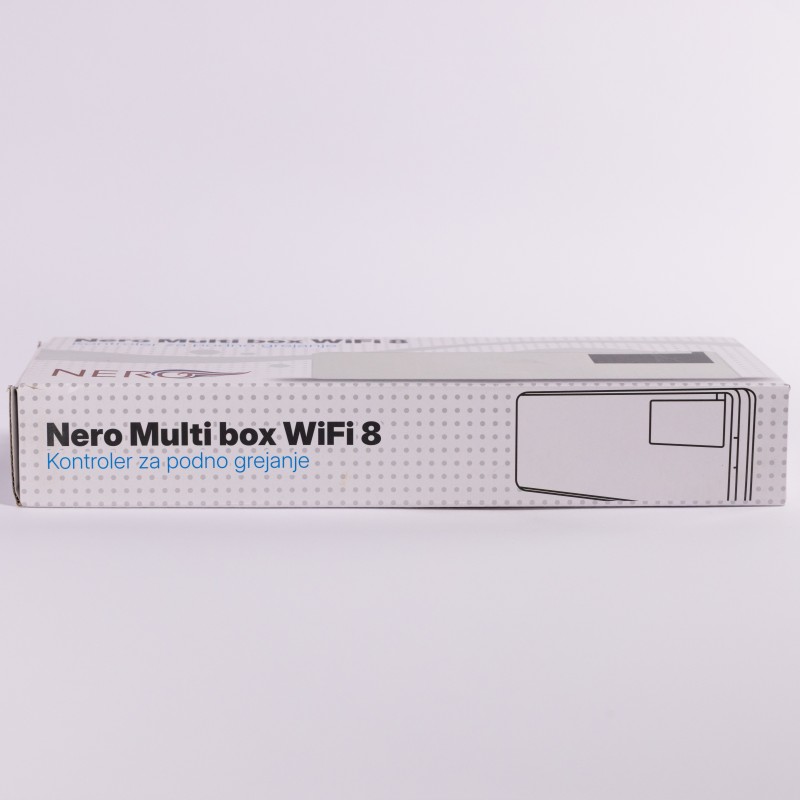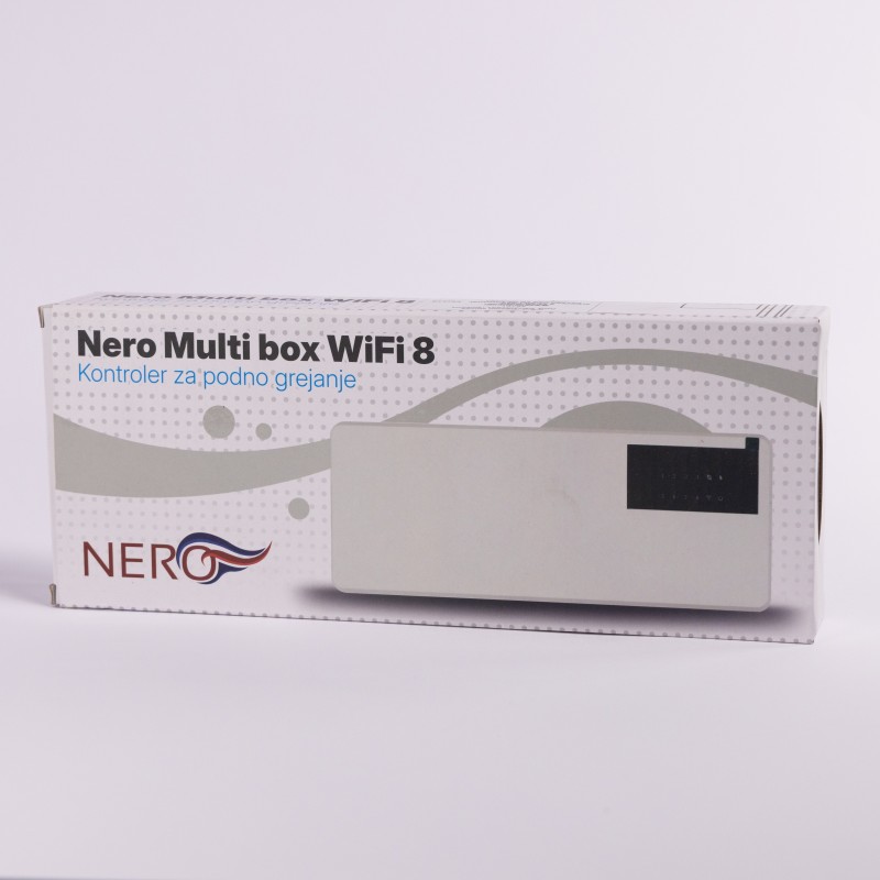 NERO Multi Box Wi-Fi 8 je centralna kontrolna jedinica namenjena upravljanju sistemima podnog grejanja sa do 8 nezavisnih zona (prostorija). Uređaj omogućava centralizovanu kontrolu termičkih aktuatora, cirkulacione pumpe i kotla, uz mogućnost Wi-Fi daljinskog upravljanja putem aplikacije.