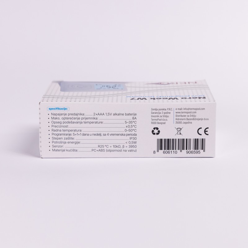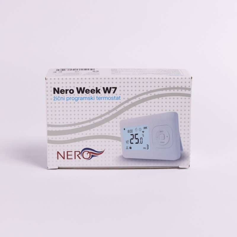 Žični sobni termostat NERO Week W7 je digitalni programabilni termostat namenjen preciznoj regulaciji sistema grejanja u stambenim i poslovnim objektima. Omogućava korisniku da unapred definiše temperaturne režime po danima u nedelji, čime se postiže visok nivo komfora i racionalna potrošnja energije.