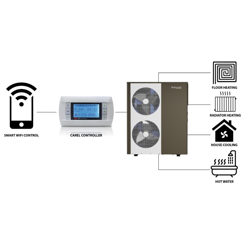 Mareli RubynoR toplotne pumpe vazduh/voda u monoblok izvedbi nude najekonomičnije rešenje za grejanje i hlađenje, kako u niskotemperaturnom režimu podnog grejanja & hlađenja i fan coil jedinica, tako i u režimu radijatorskog grejanja, naročito u hibrid kombinaciji sa uparenim kotlom na pelet.